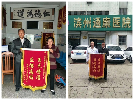 看到康复的妻子,刘焕云的丈夫特别高兴,夫妻俩一块来到滨州通康医院送来锦旗表示对宋院长的衷心感谢。